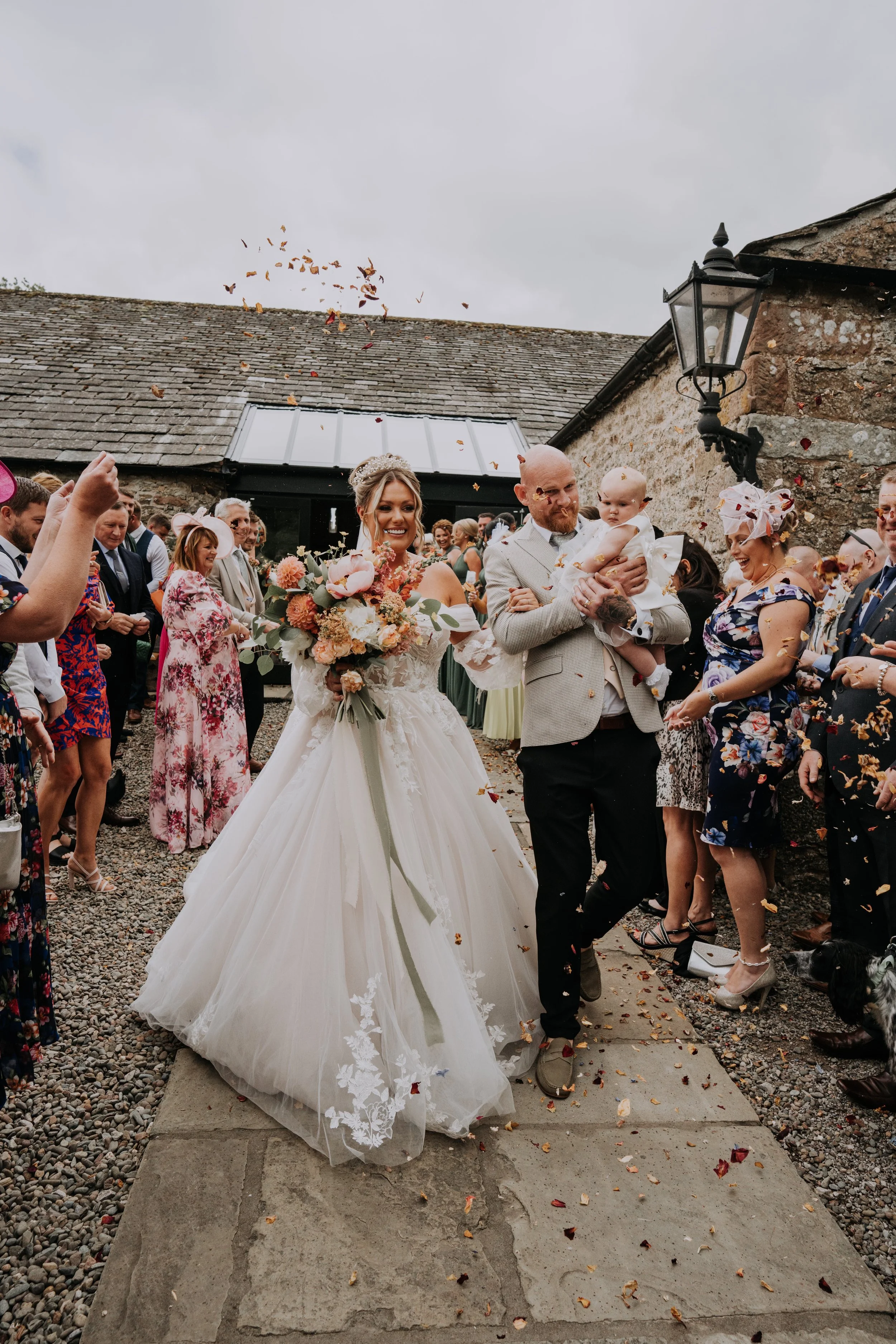 A bride and groom walking down an aisle outdoors, with the bride holding a bouquet and the groom carrying a baby. Guests are gathered on either side, dressed in formal attire, and are throwing flower petals. The setting appears rustic with a stone bu