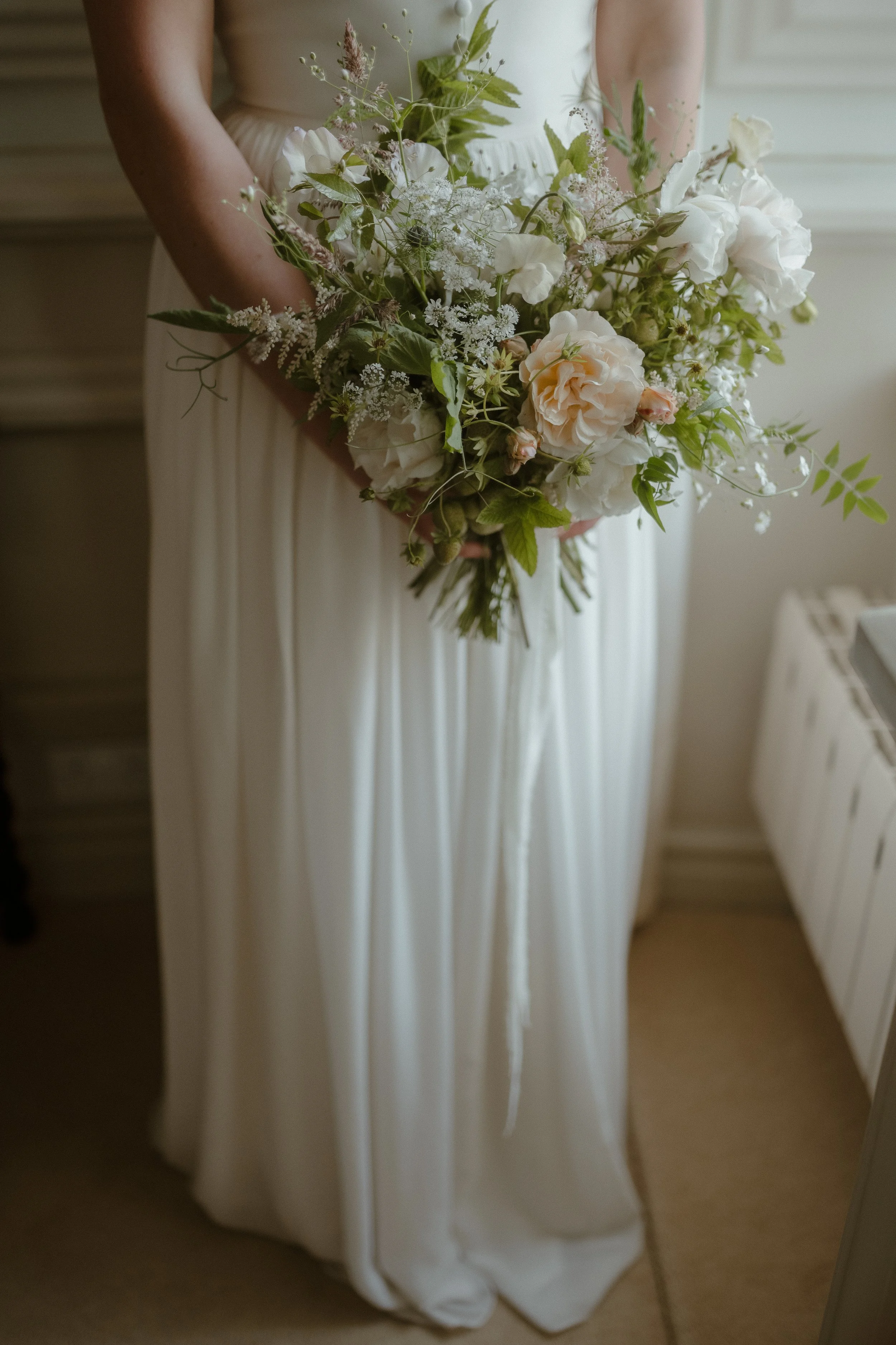 Bride in white dress holding a rustic bouquet with greenery and dried flowers.