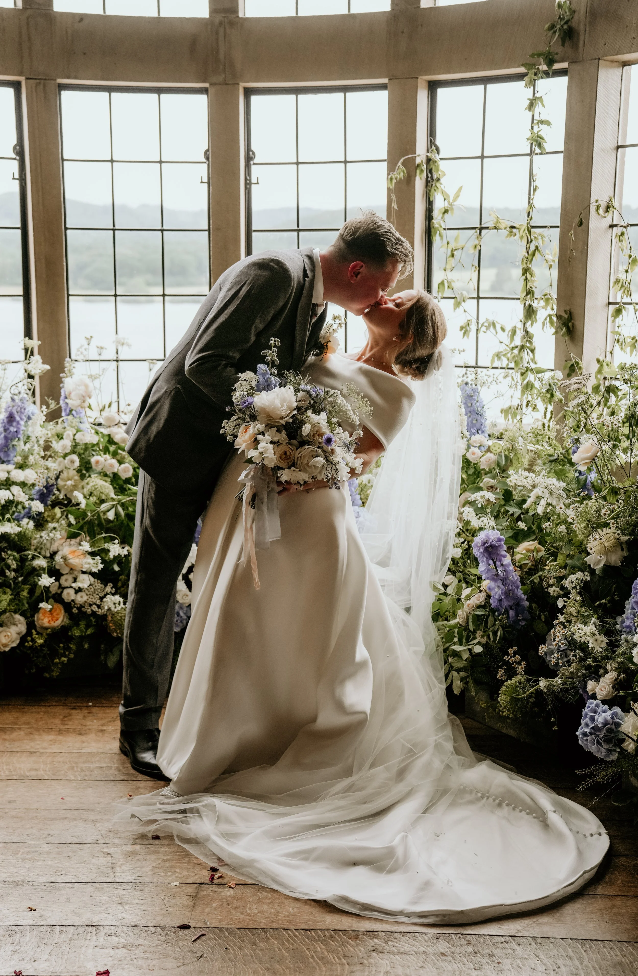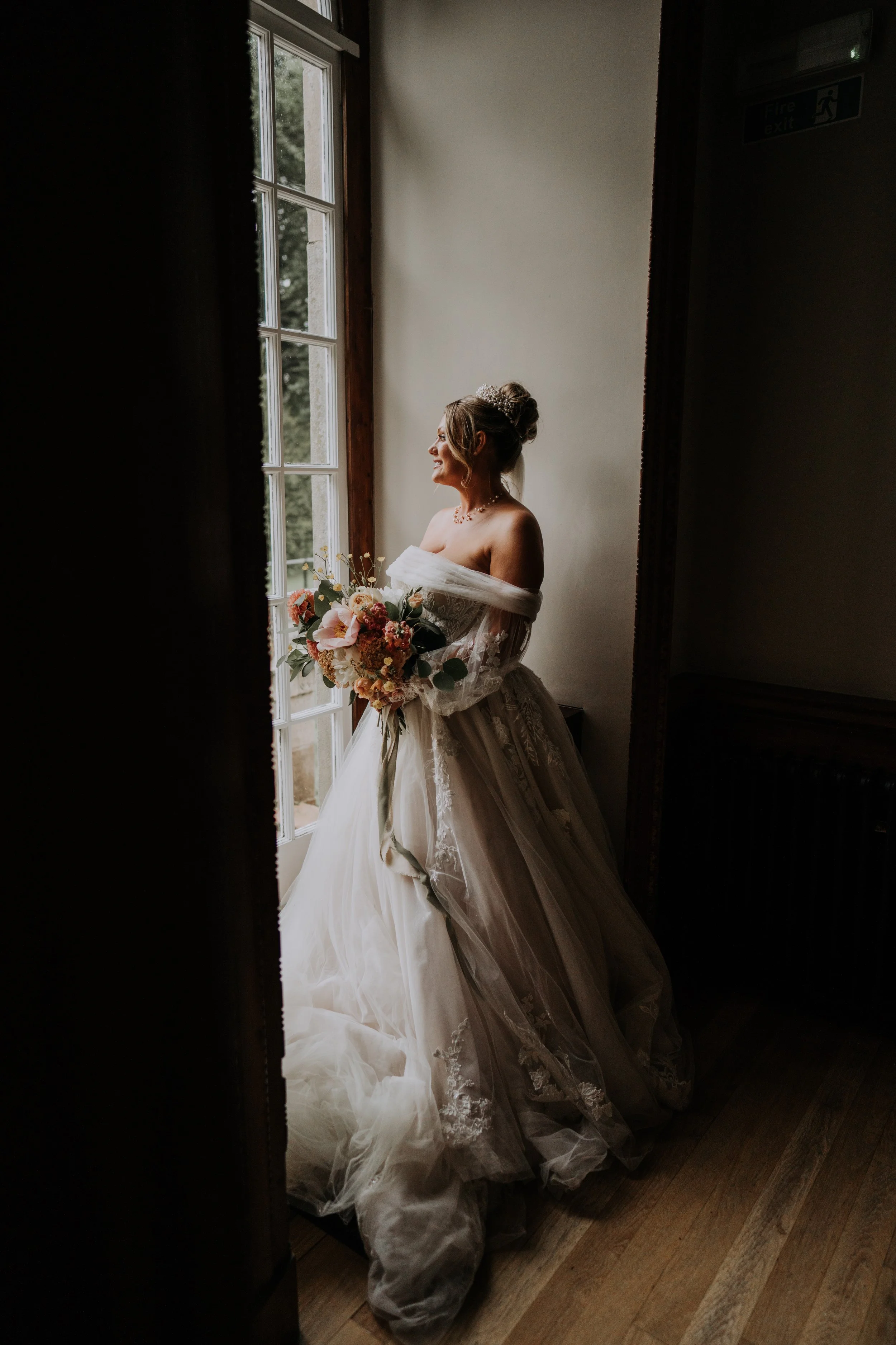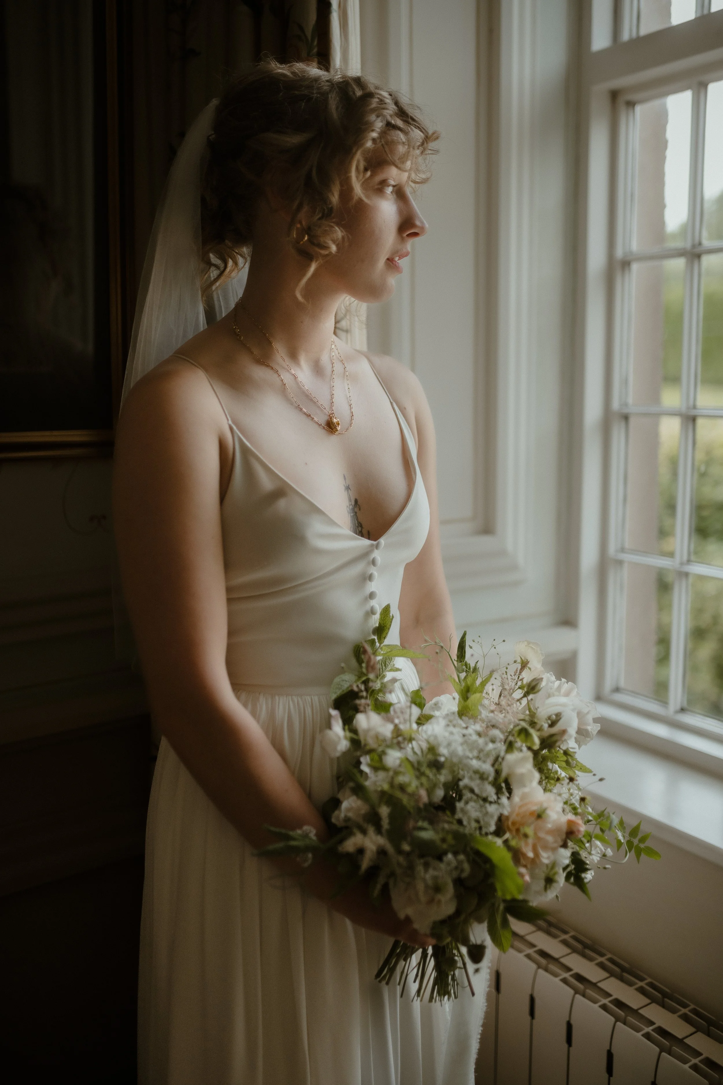 Bride in white wedding dress holding bouquet, standing by a window with natural light.