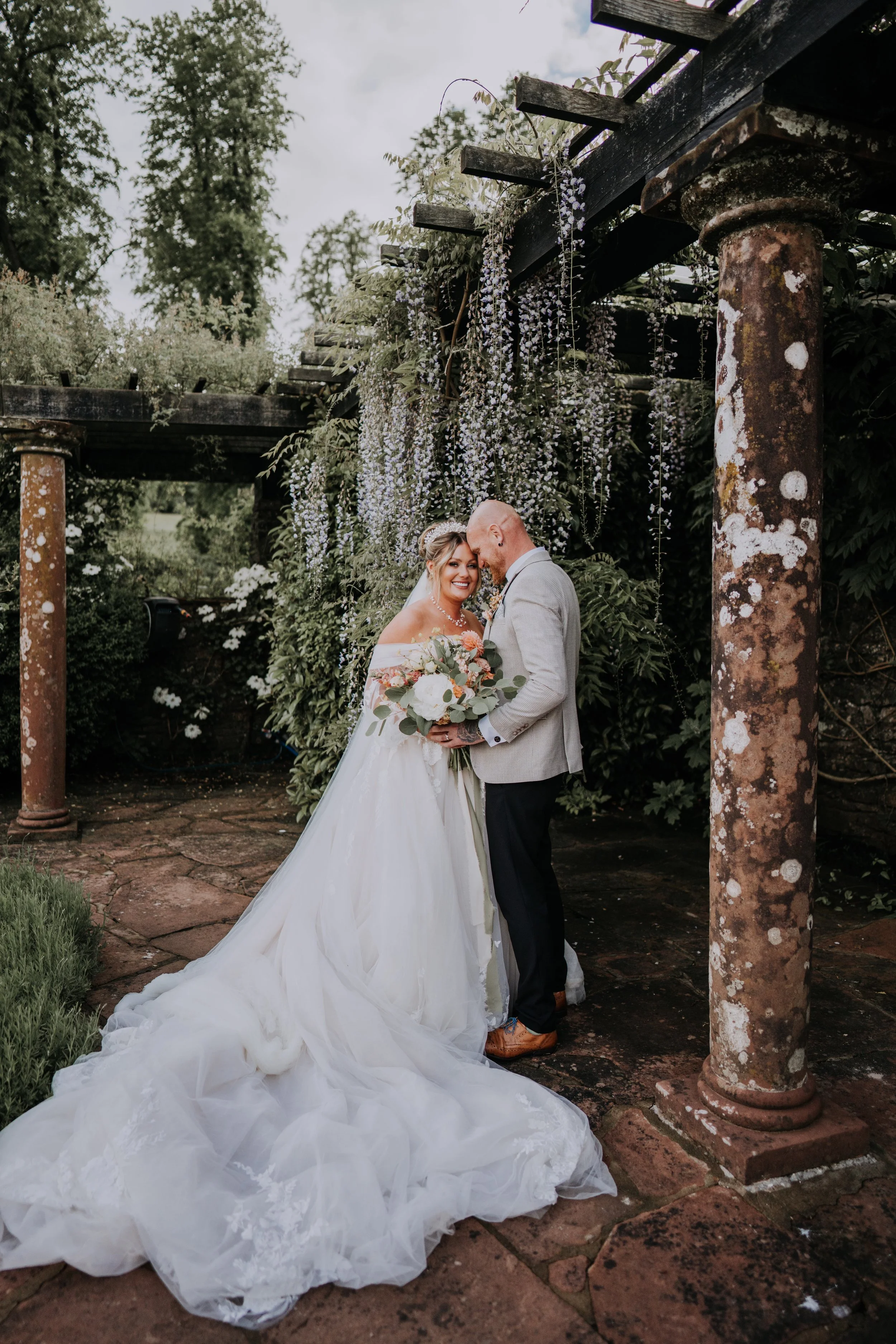 A bride and groom embracing in a garden setting with stone columns and wisteria vines.