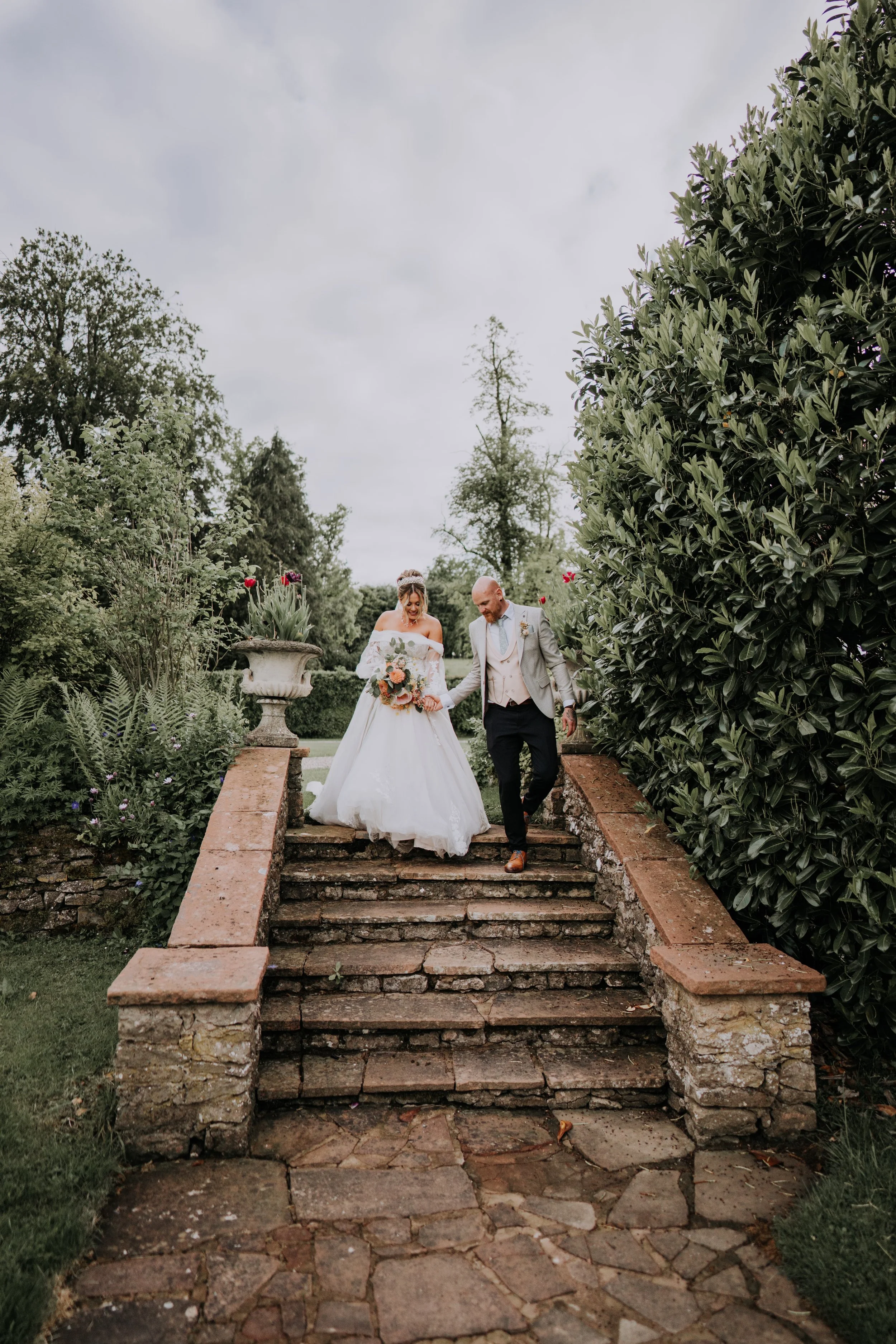 Bride in white gown and groom in beige suit walking down stone steps in a garden.