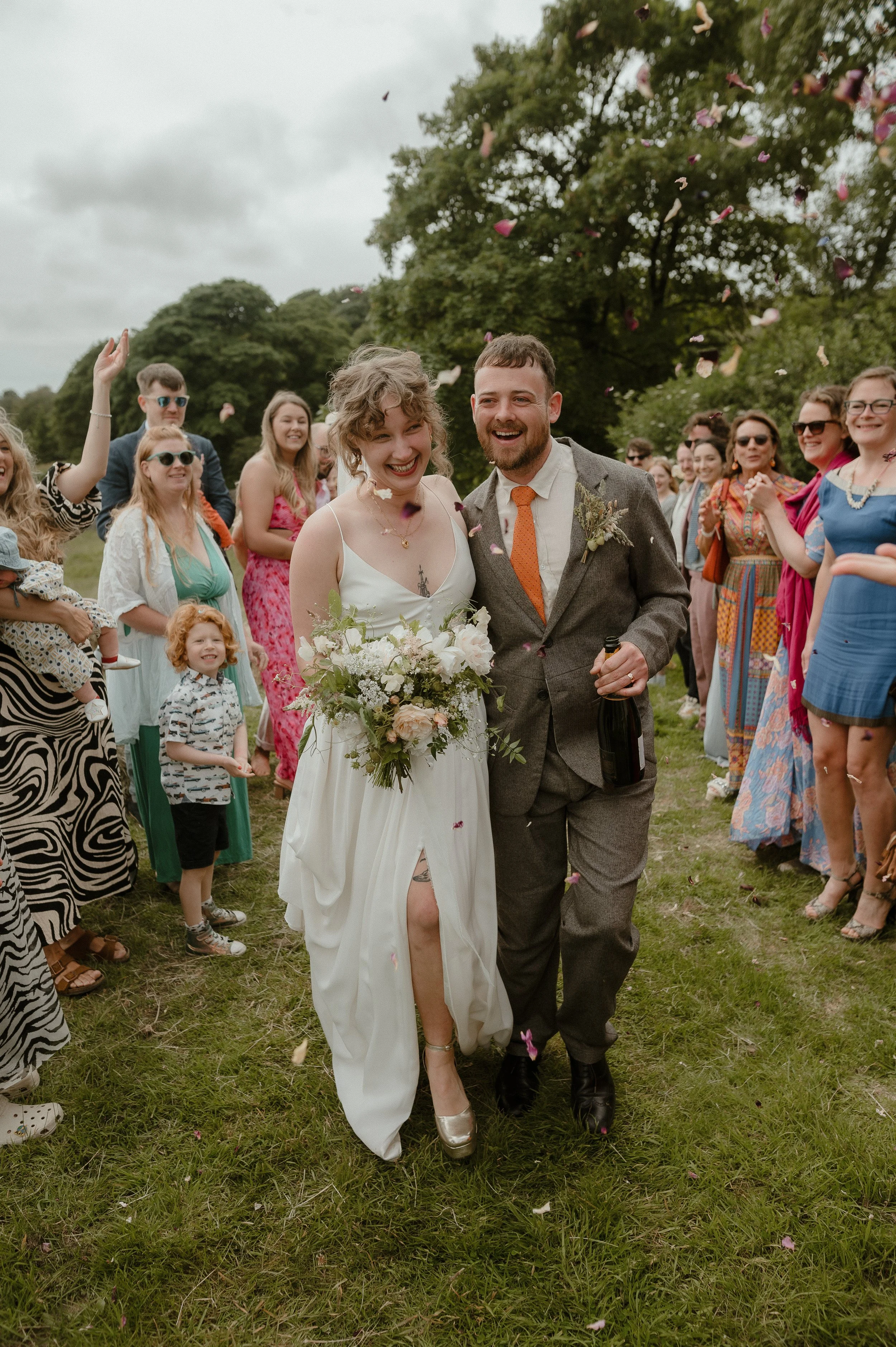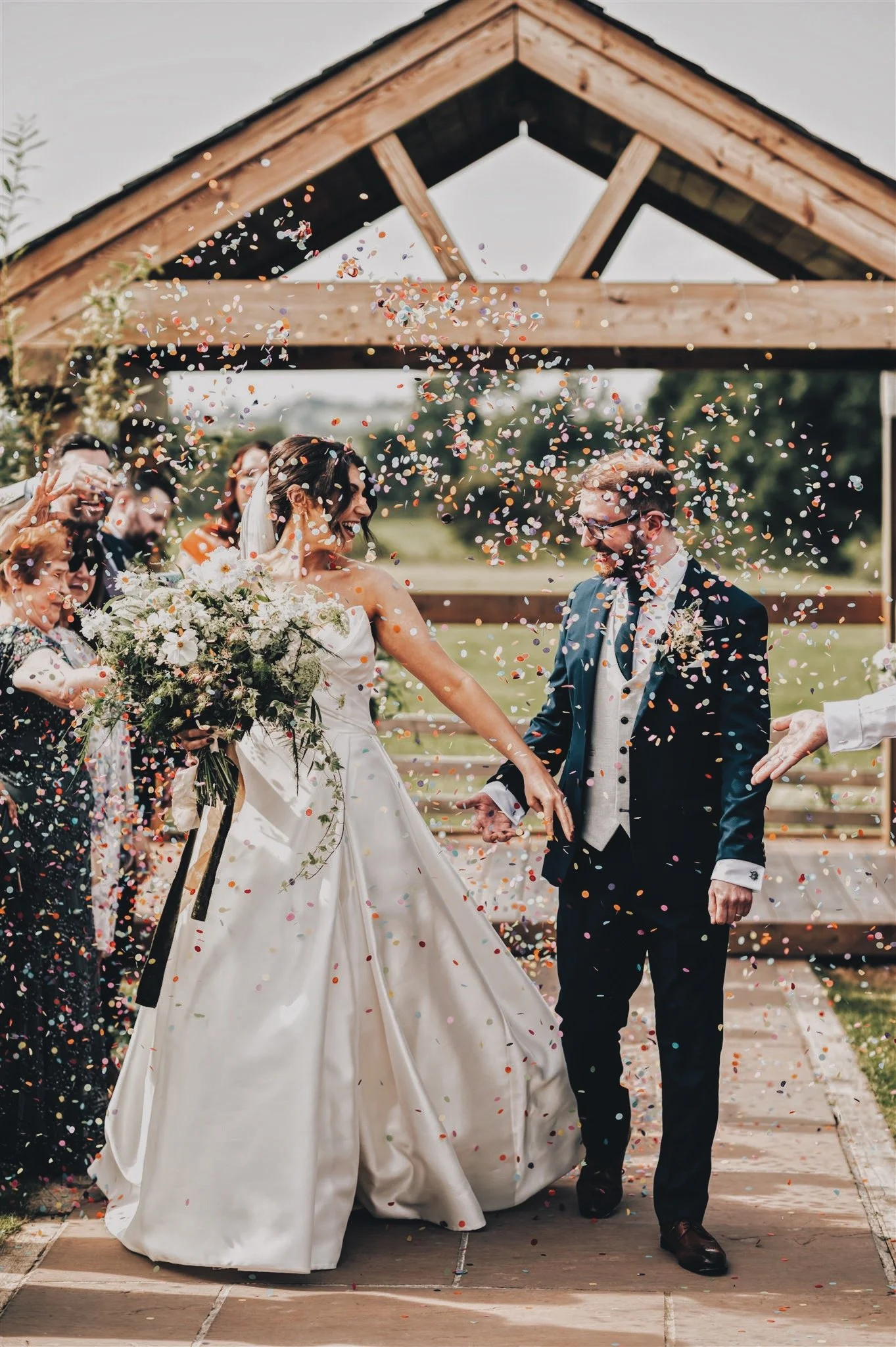 Bride and groom walking down an aisle outdoors under a wooden arch, surrounded by confetti and smiling guests, with the bride holding a large bouquet.