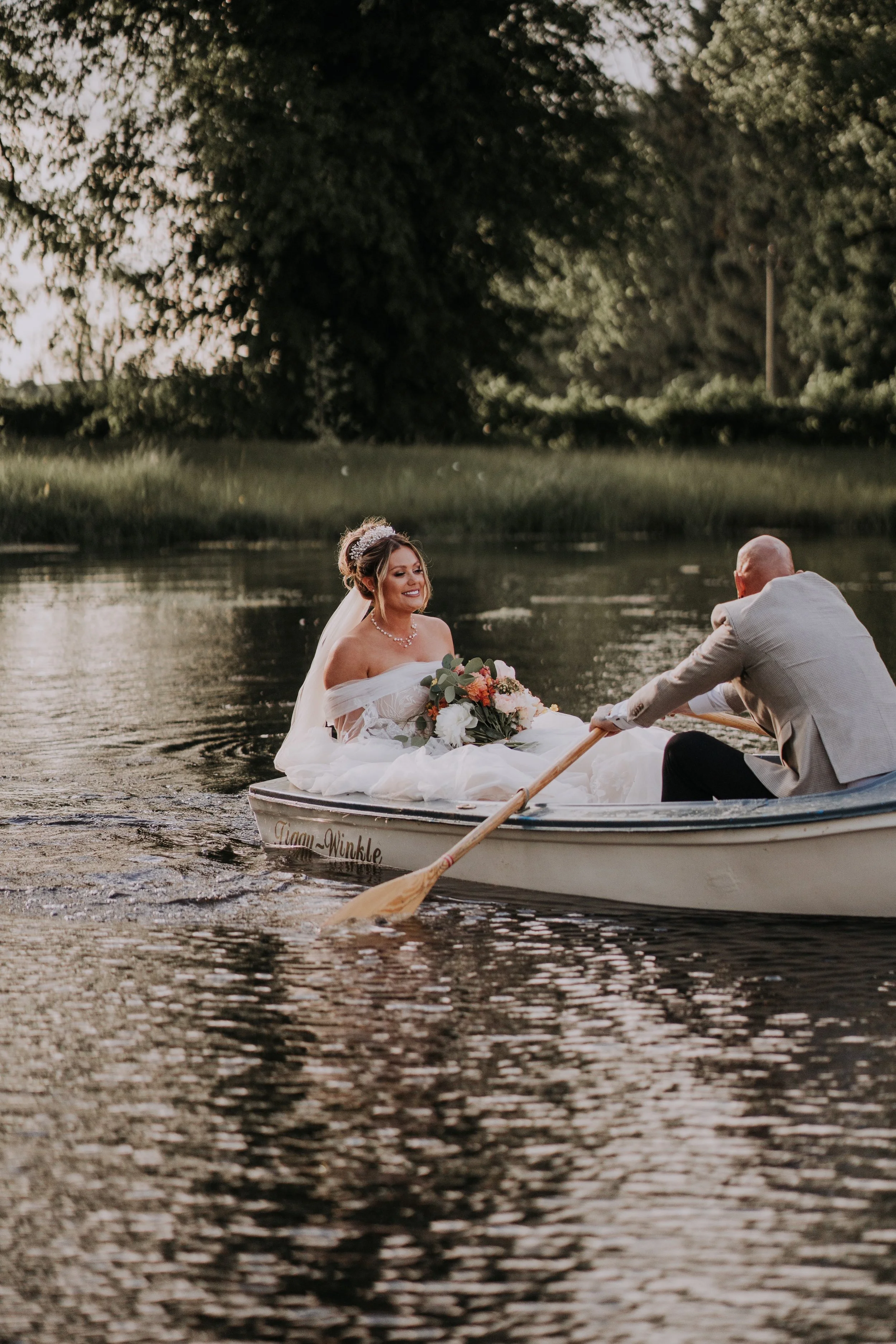 Bride and groom in a rowboat on a lake, with the groom rowing and the bride holding a bouquet, surrounded by trees and water.