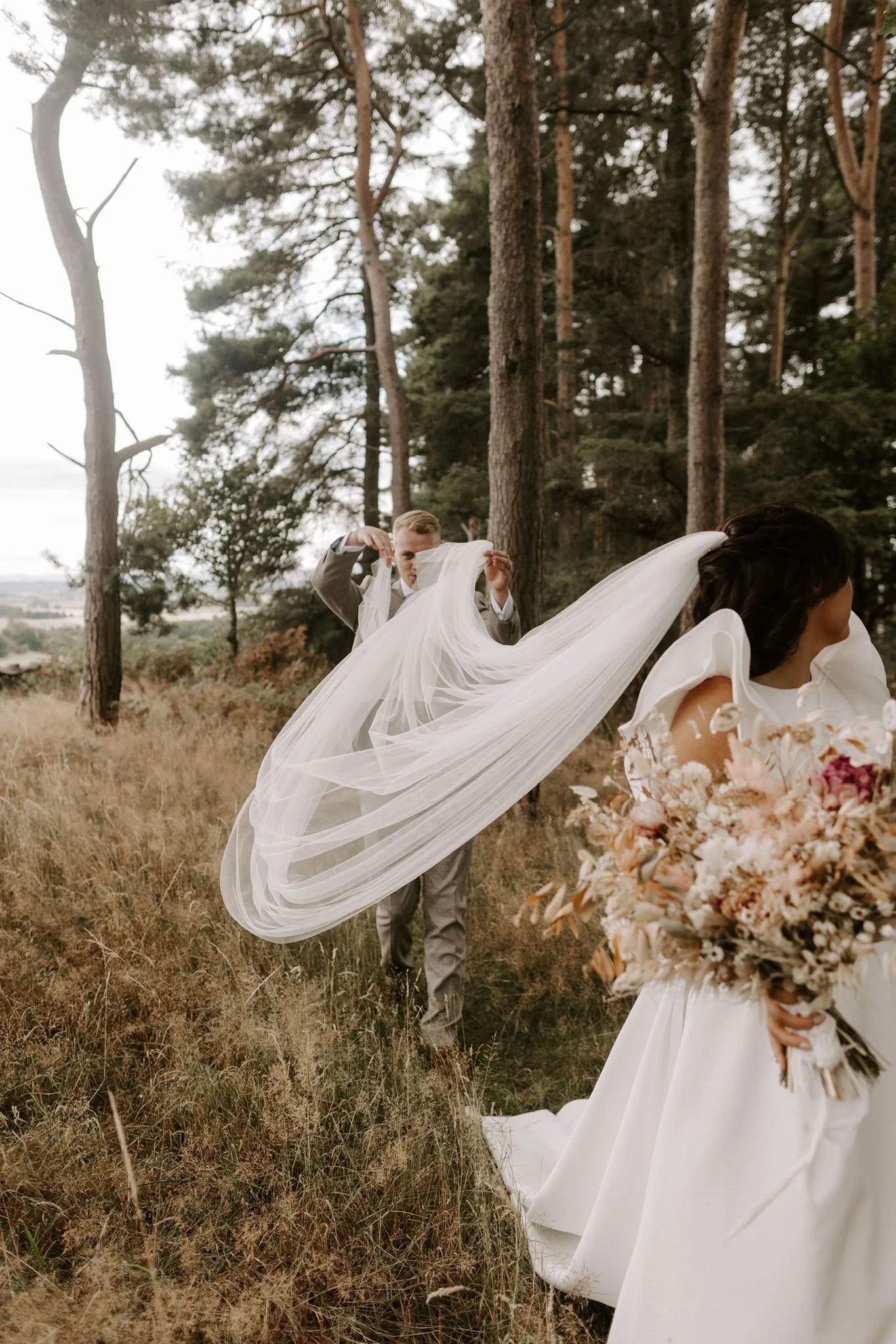 Bride with bouquet and long veil in a forest, assisted by a man adjusting her veil.