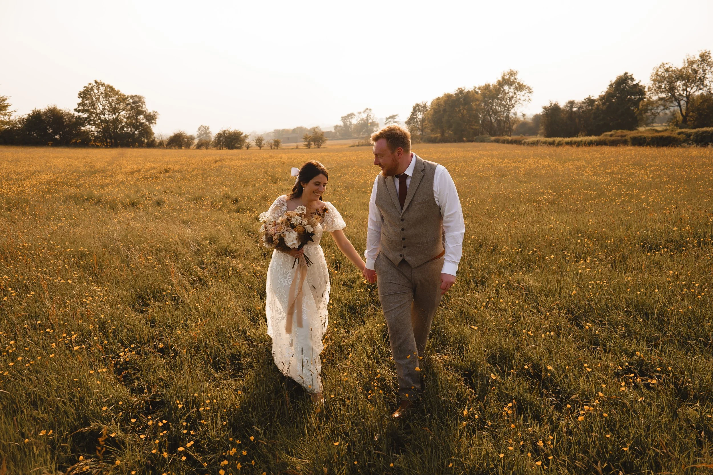 A bride in a white wedding dress holds a bouquet as she walks hand-in-hand with a groom in a gray suit across a field with yellow flowers and trees in the background.