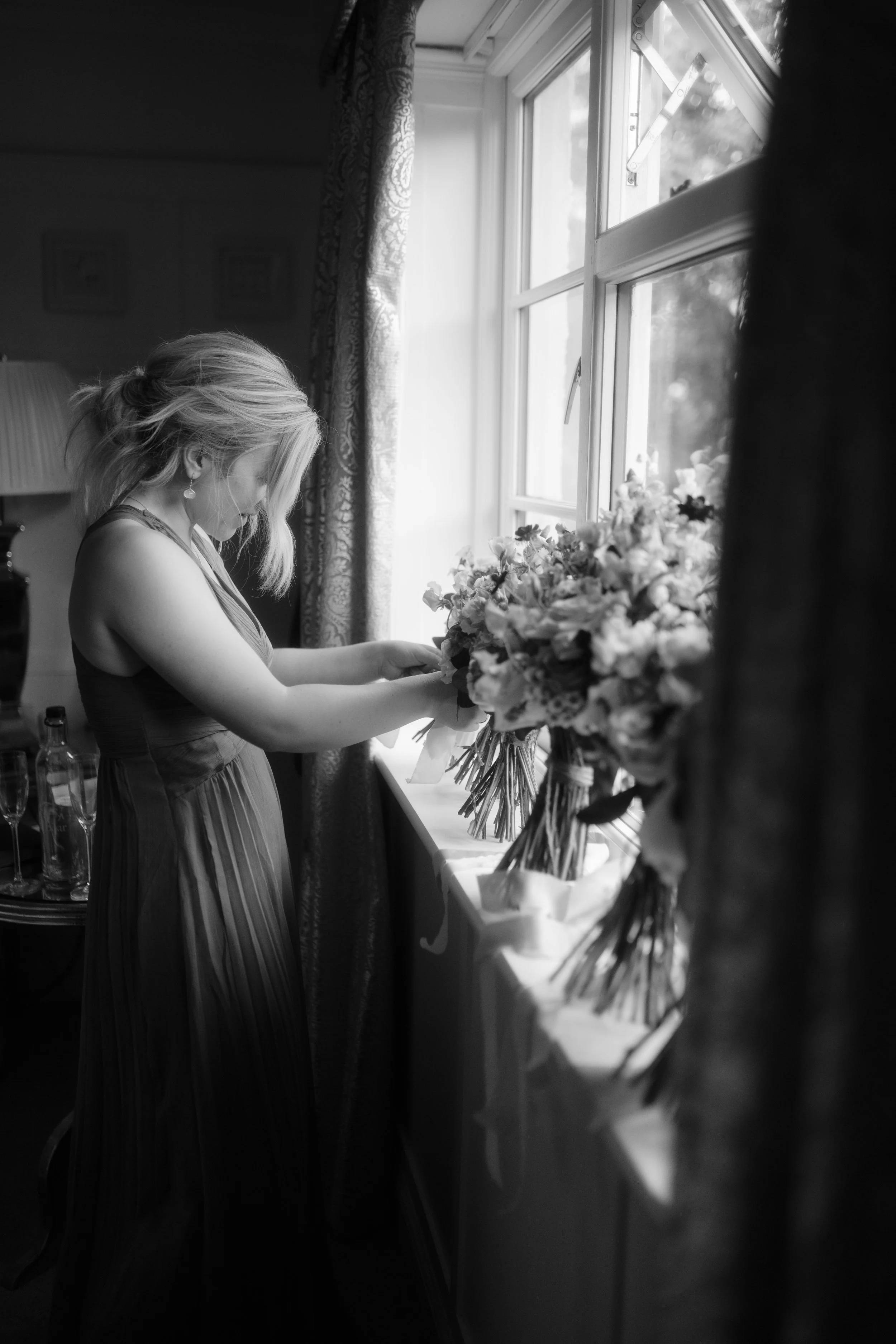 Woman in dress arranging flowers by a window in black and white.