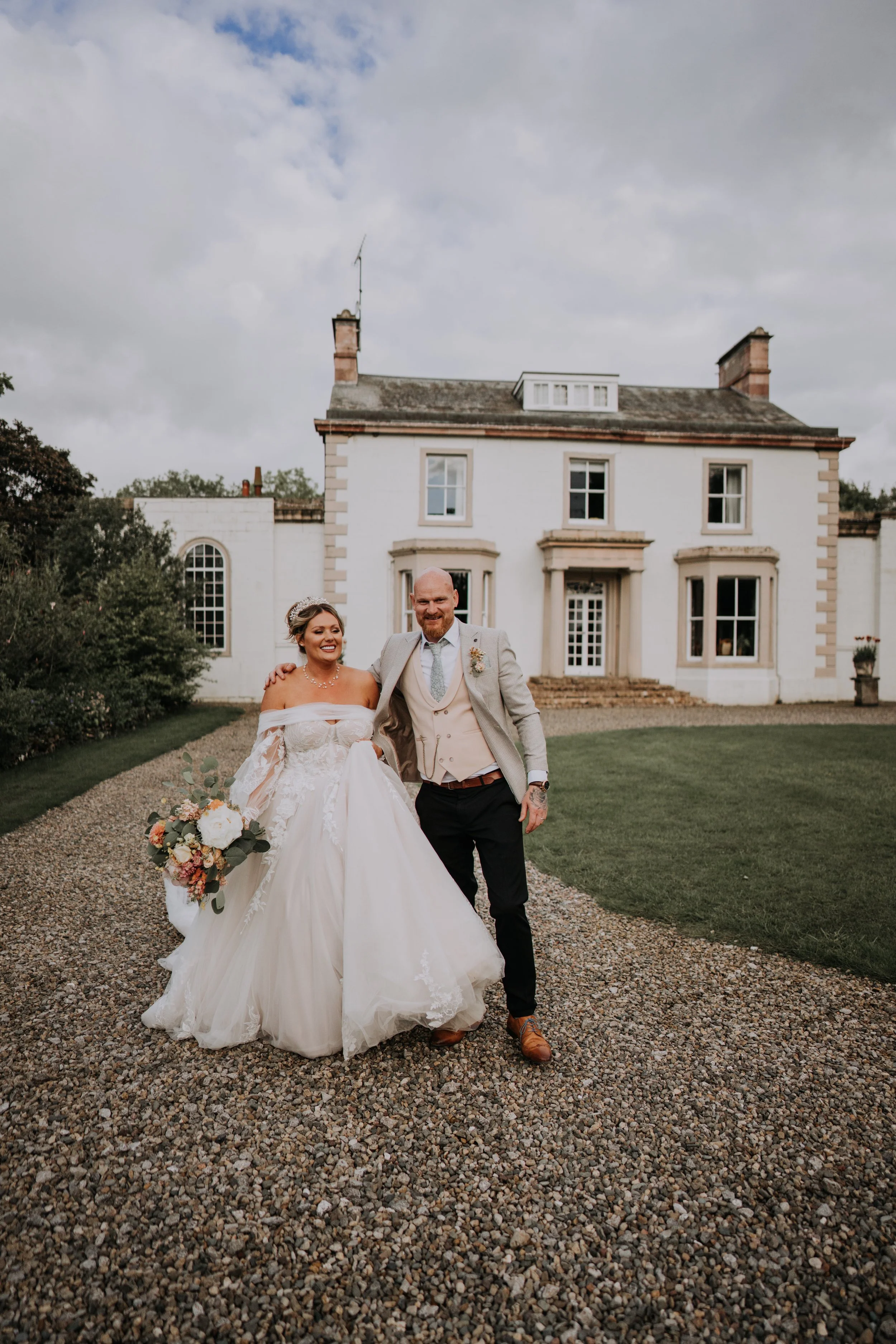 A bride and groom walking on a gravel path in front of a white house. The bride is wearing a white wedding dress and holding a bouquet of flowers. The groom is in a beige suit with black pants and brown shoes.