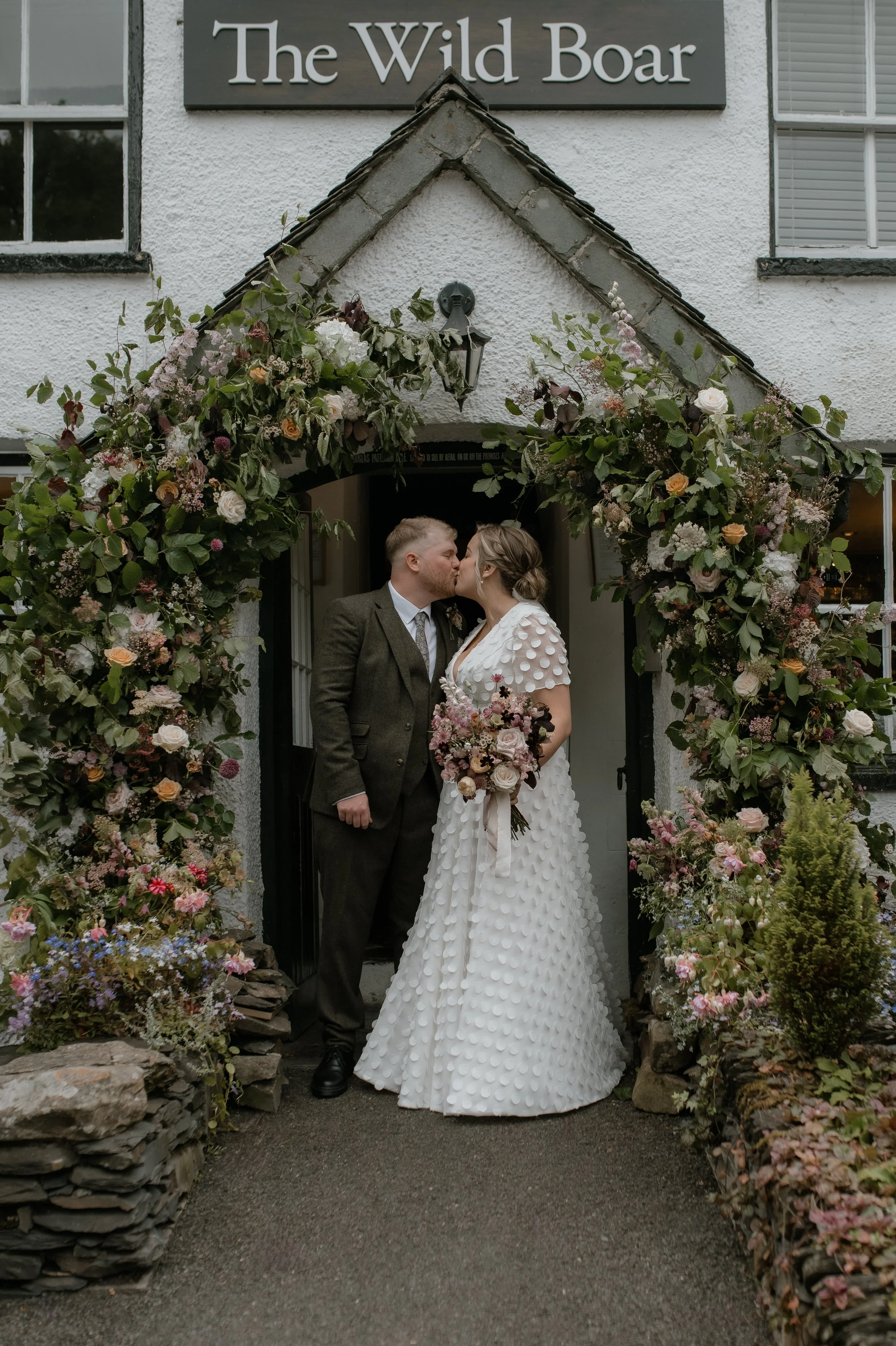 Bride and groom kissing under floral arch at The Wild Boar entrance.