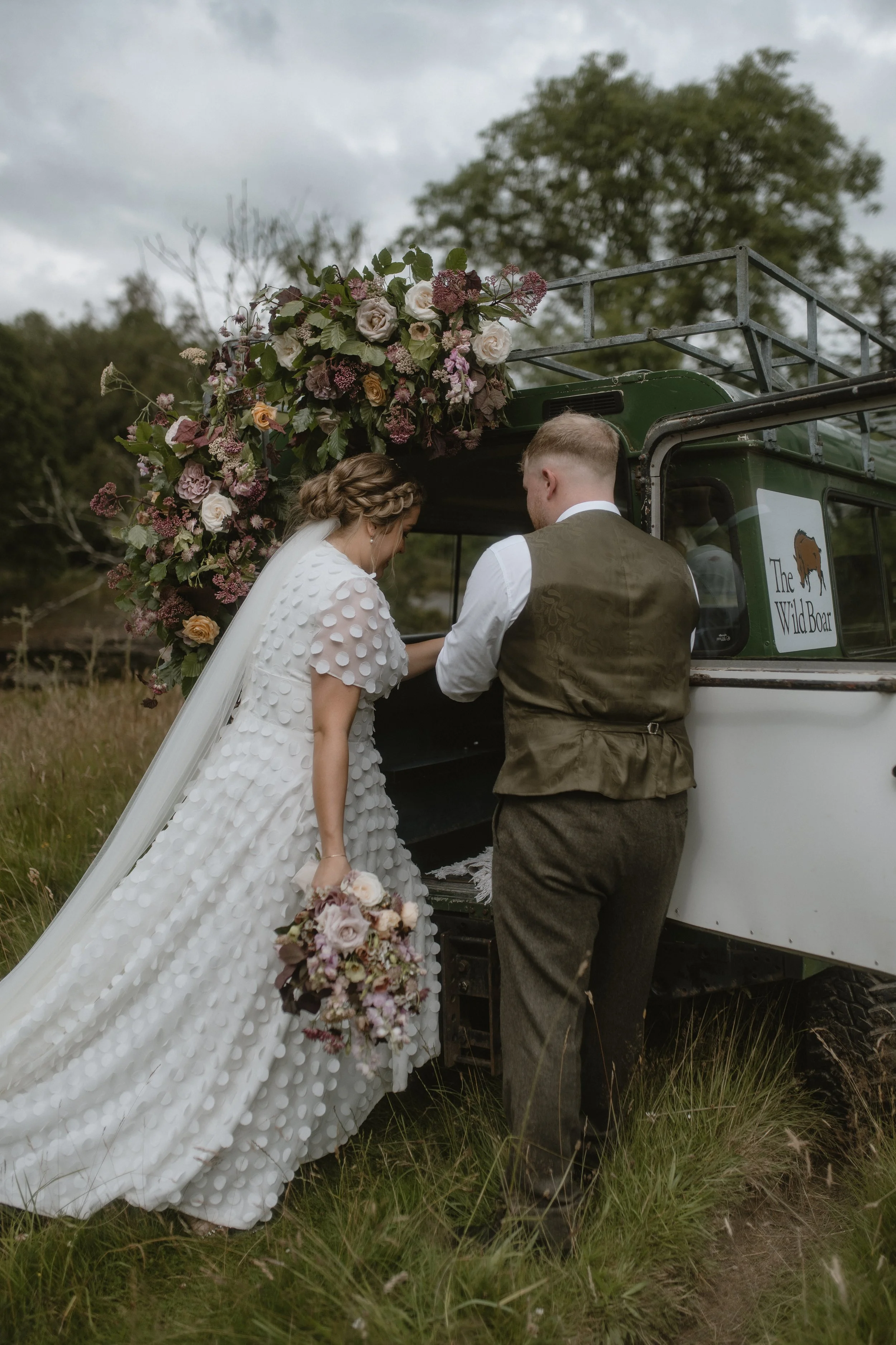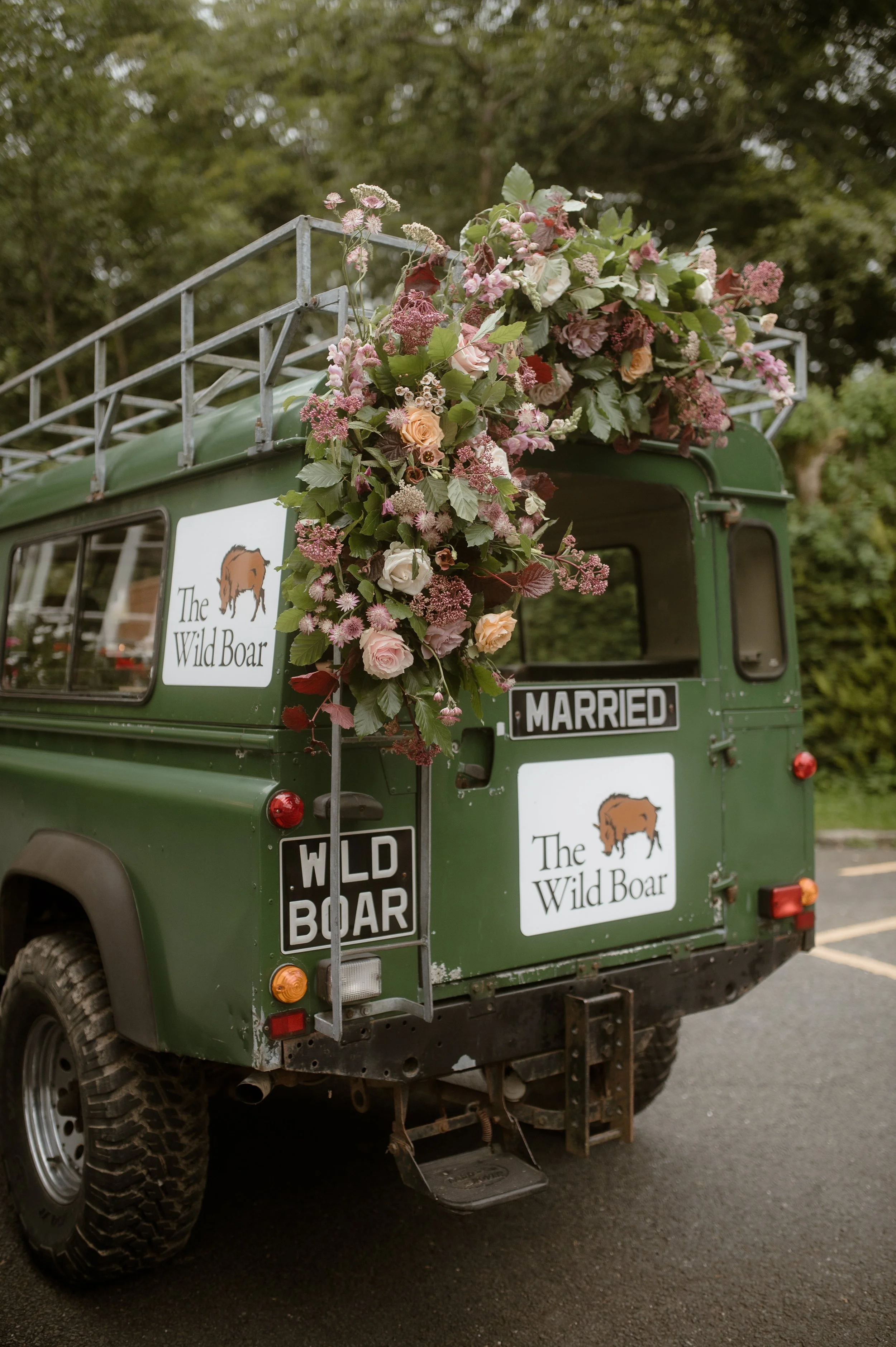 Green vintage Land Rover decorated with flowers, "The Wild Boar" logos, and "Married" sign on the back.