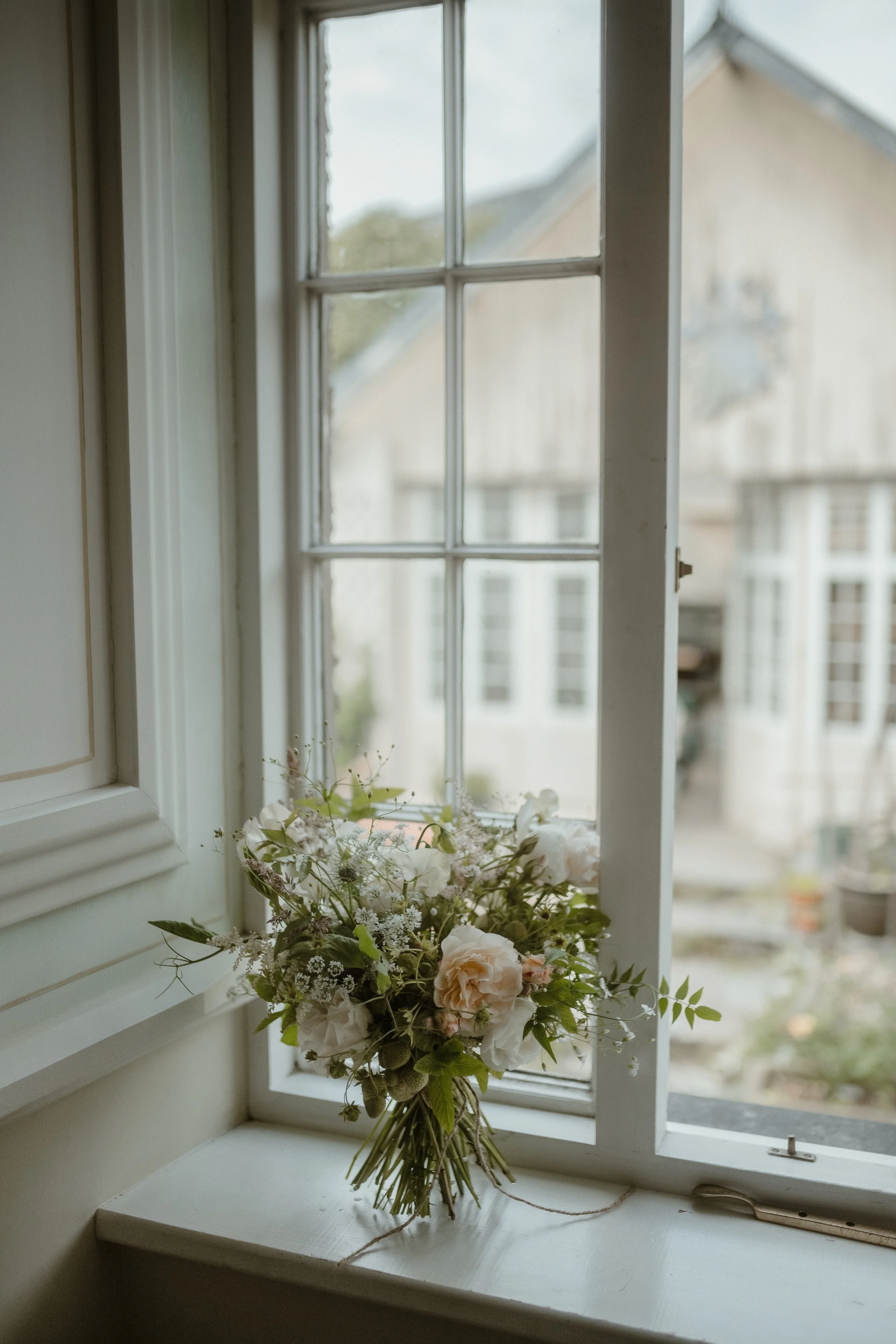 A bouquet of flowers on a window sill with an out-of-focus building visible outside.