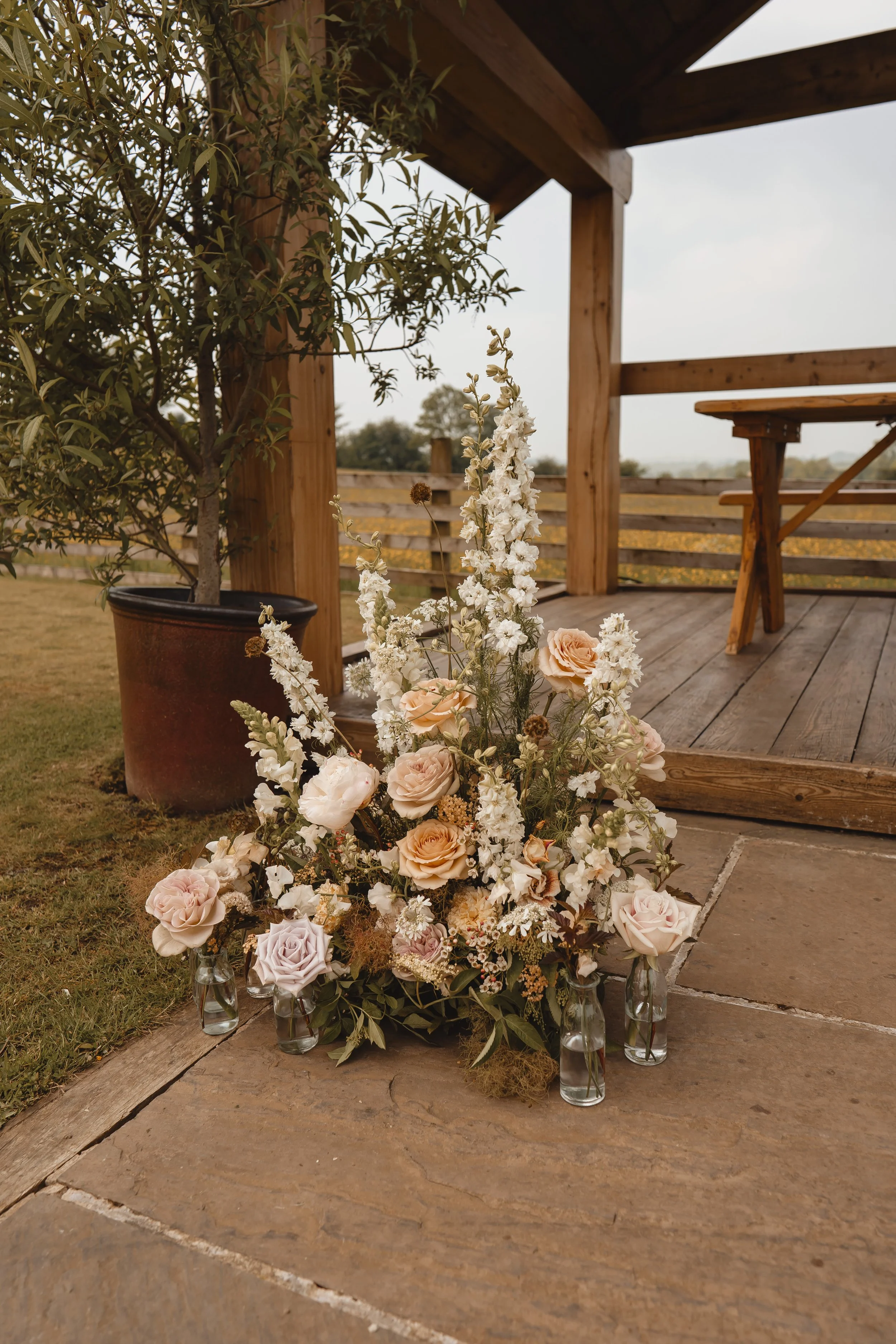 Outdoor setting with rustic wooden structure, floral arrangement with roses and white flowers, potted tree, and wooden table.
