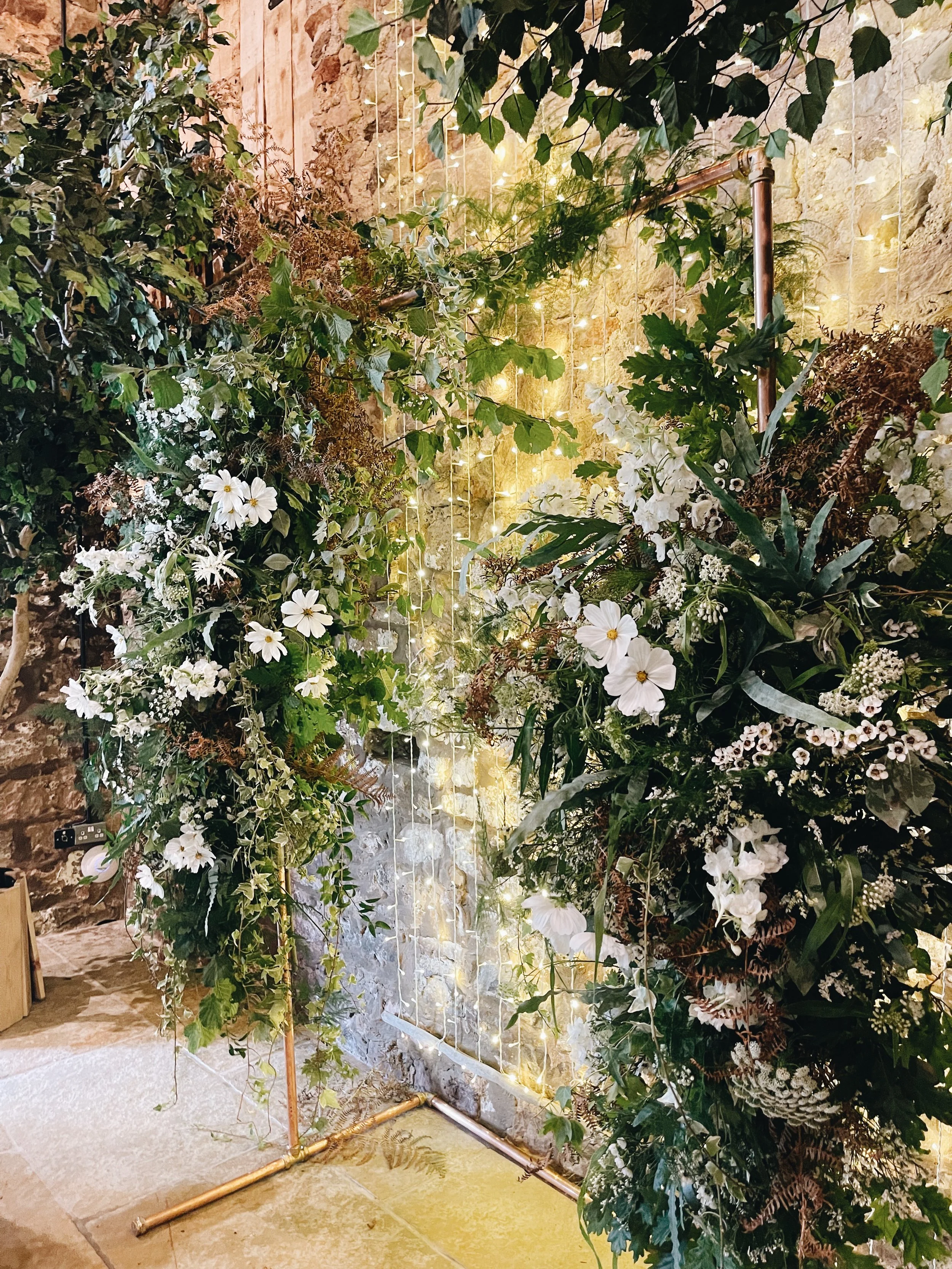 A rustic indoor setting with lush green foliage and white flowers arranged on a copper frame. The background features stone walls and warm string lights creating a cozy atmosphere.