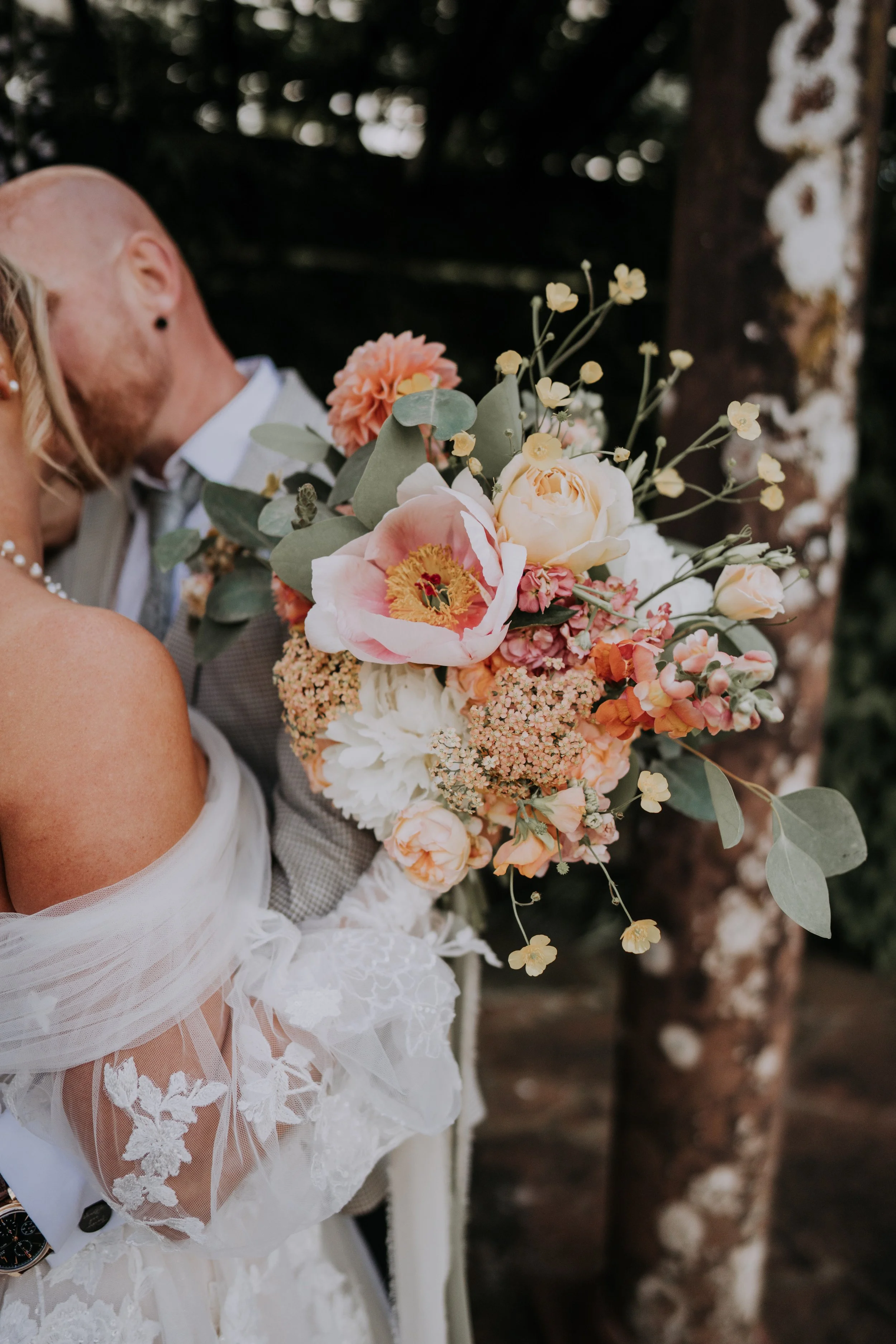 Couple embracing with bride holding a colorful bridal bouquet featuring pink, yellow, and white flowers, and lace details on the wedding dress.