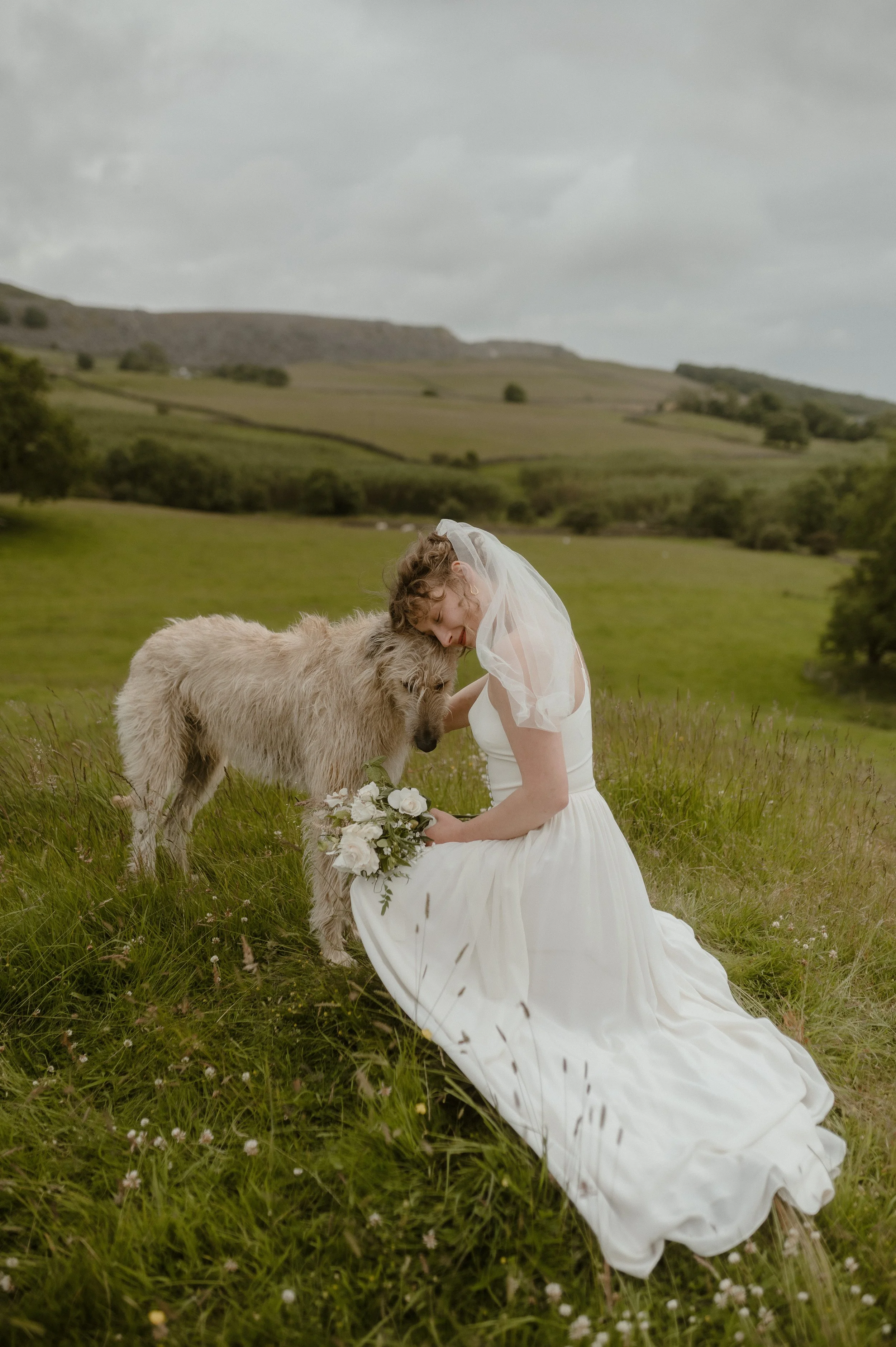 Bride in white dress with bouquet, kneeling in a field, head to head with a large shaggy dog, rolling landscape in the background.