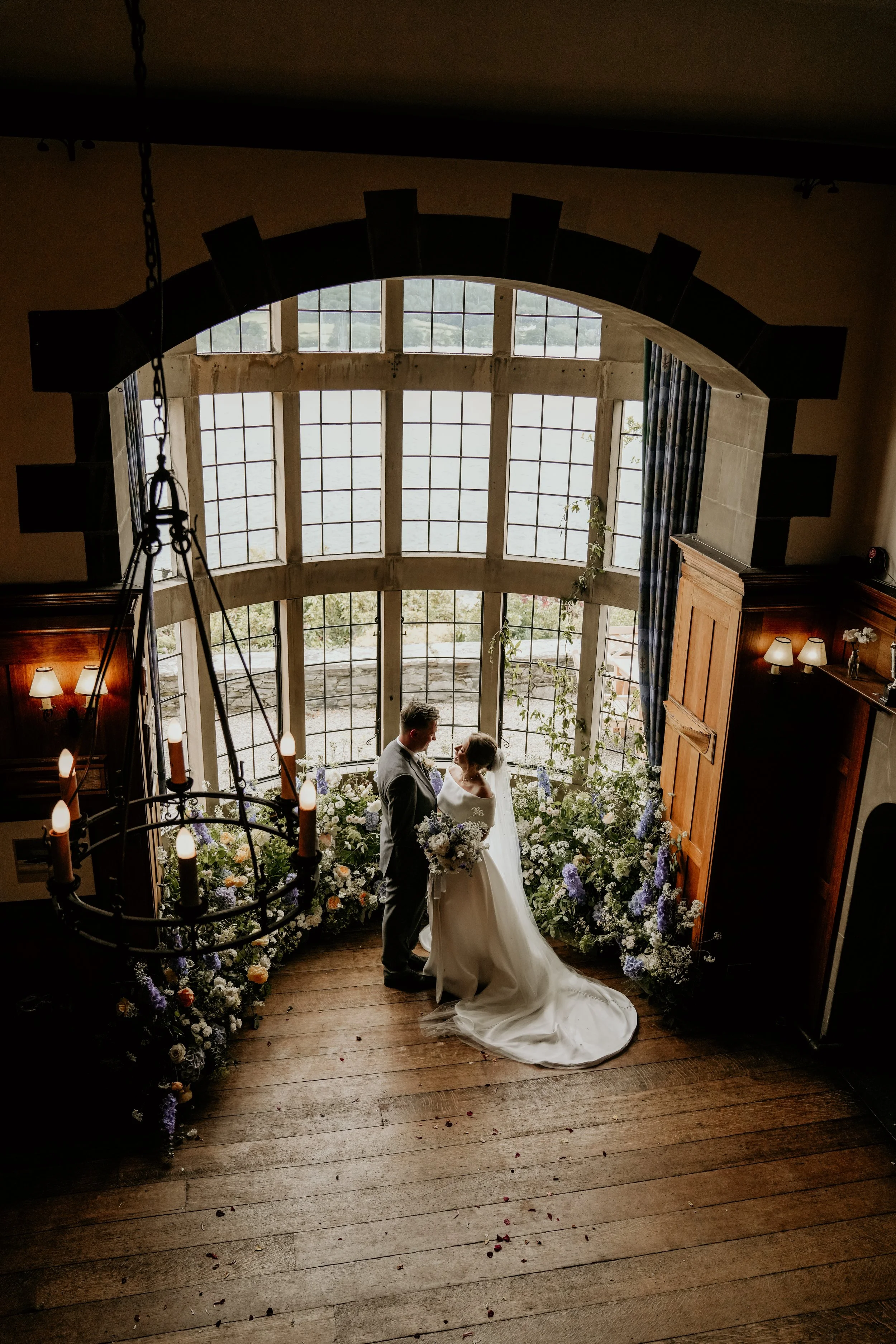 Bride and groom standing in a rustic wedding venue with stone walls and fairy lights, surrounded by decorated tables and floral arrangements.