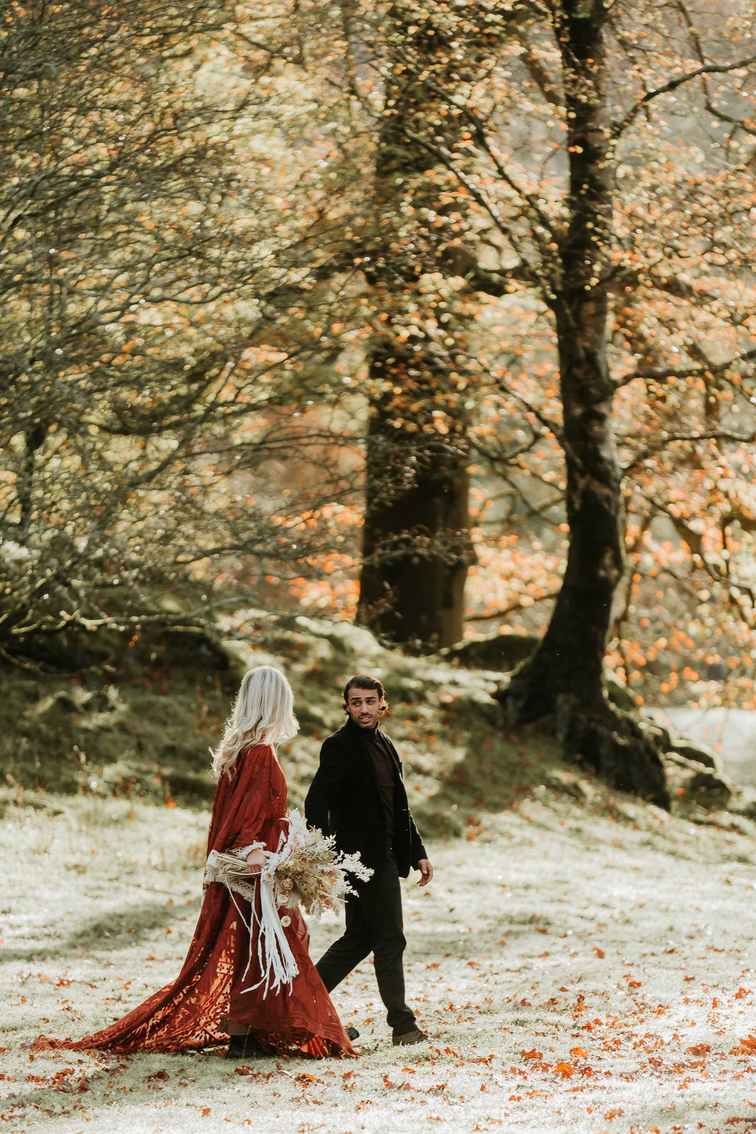 A couple walking in an autumn forest, the woman in a red dress holding a bouquet, and the man in dark clothing. The ground is covered in fallen leaves, and trees with autumn foliage surround them.