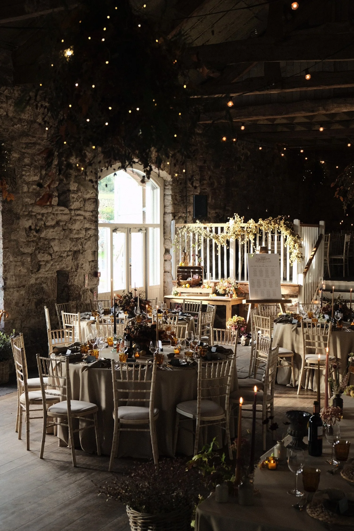 Rustic indoor wedding reception setup with round tables, beige tablecloths, and elegant wooden chairs, adorned with autumn-themed floral arrangements and candles. String lights hang from the stone walls, creating a cozy ambiance. A seating chart is d