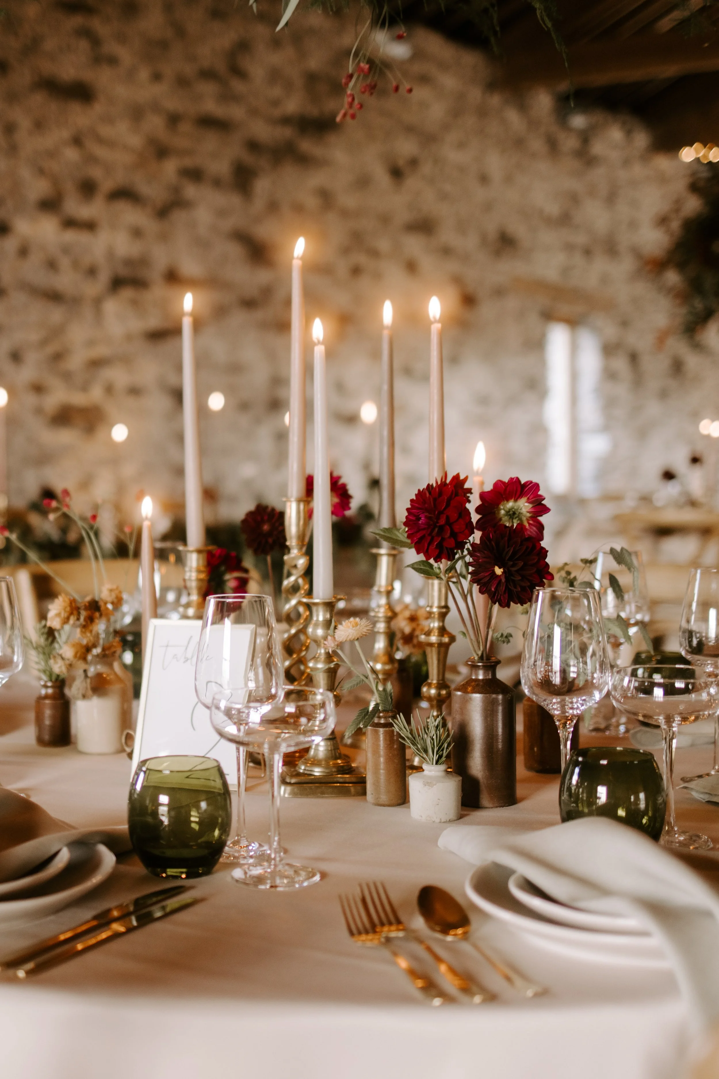 Elegant table setting in rustic venue with candles and floral decorations, stone wall backdrop, greenery hanging overhead.