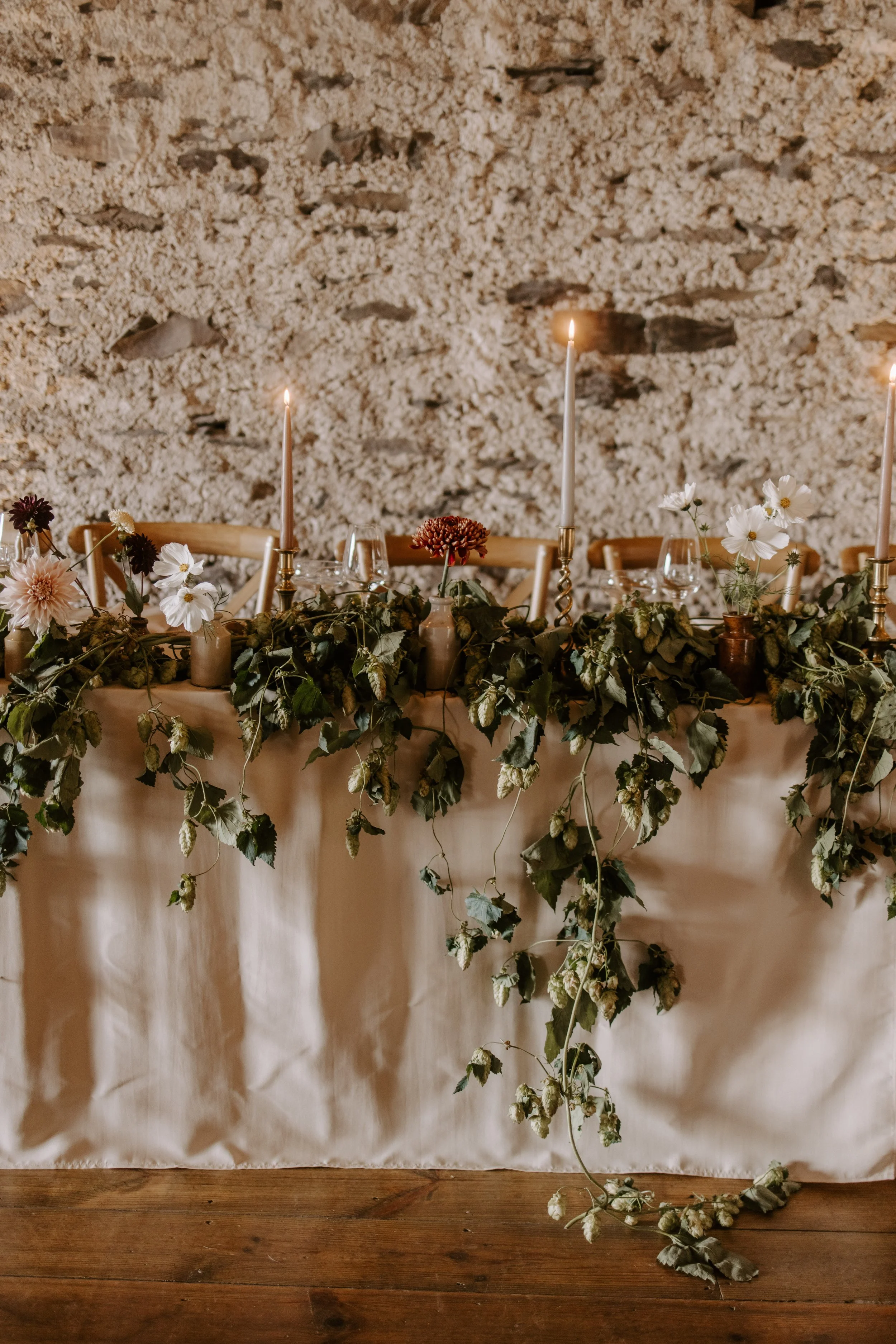 Table with white tablecloth, greenery garland, candles, and flowers against stone wall