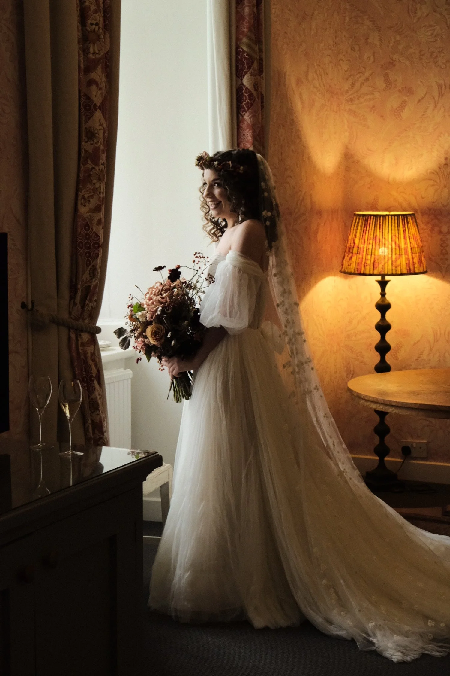 Bride in white gown holding bouquet, standing by a window with curtains and a lit lamp, smiling.