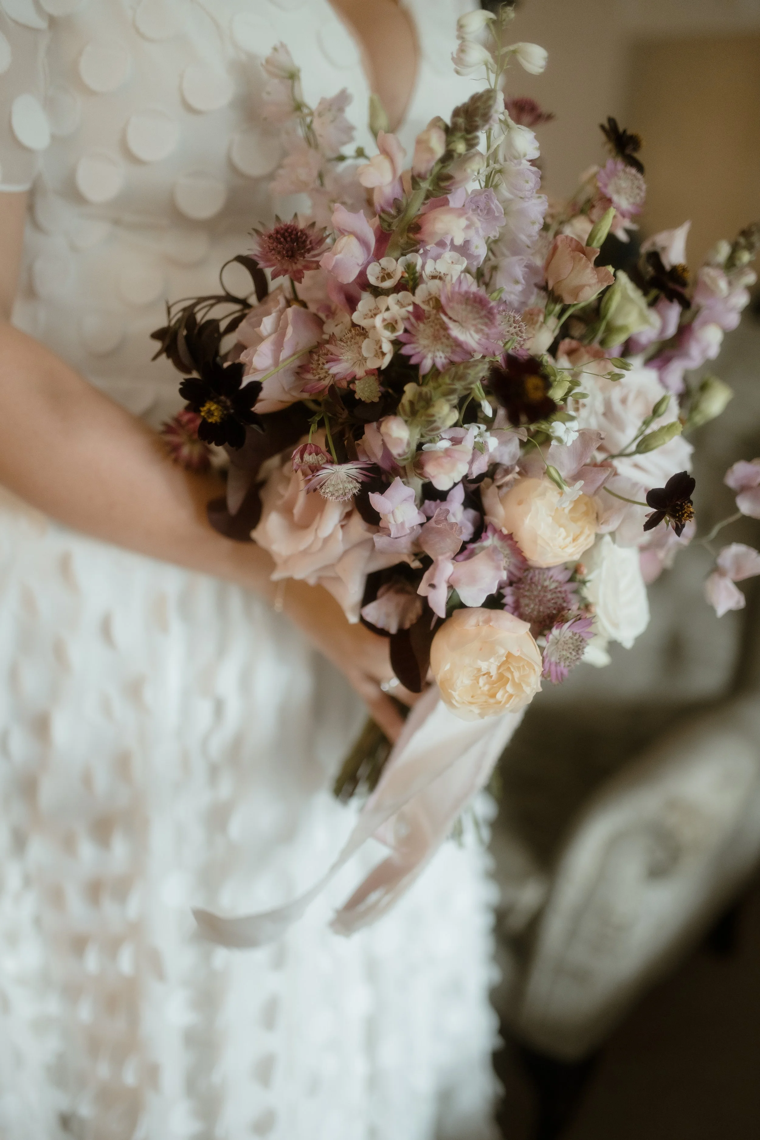 Bride holding a bouquet of pastel-colored flowers, wearing a white dress with circular patterns.