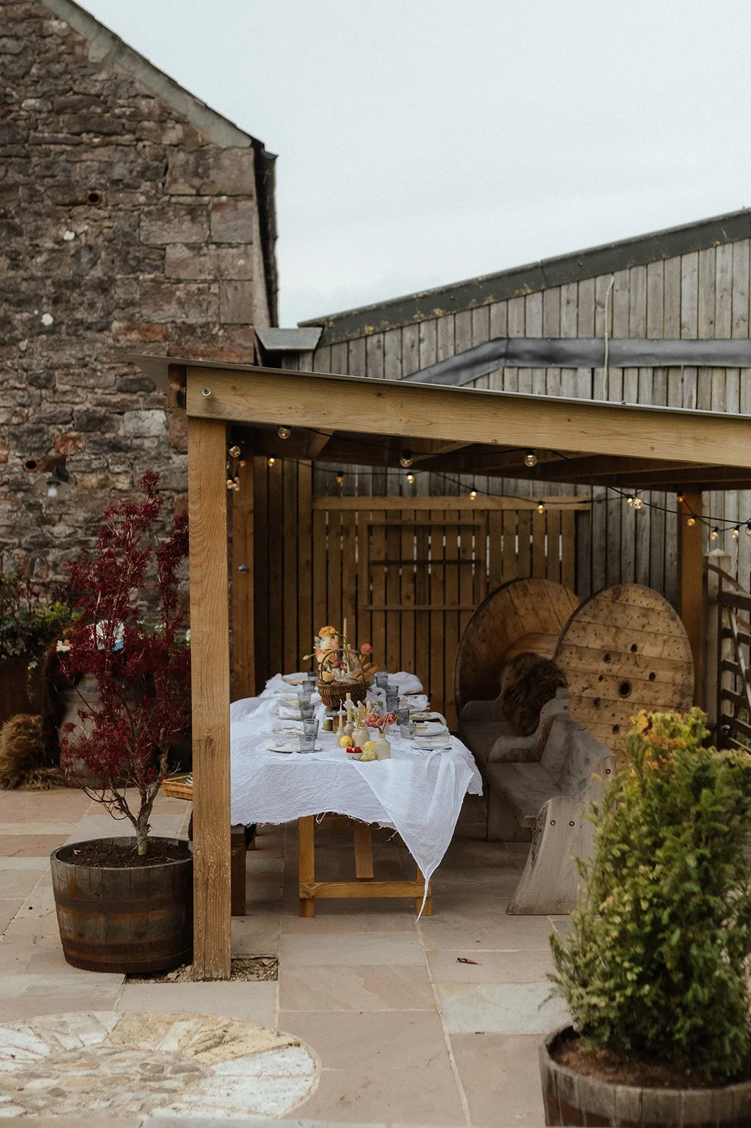 Outdoor patio with a table set for a meal, covered by a wooden canopy with string lights, surrounded by potted plants and rustic wooden structures.