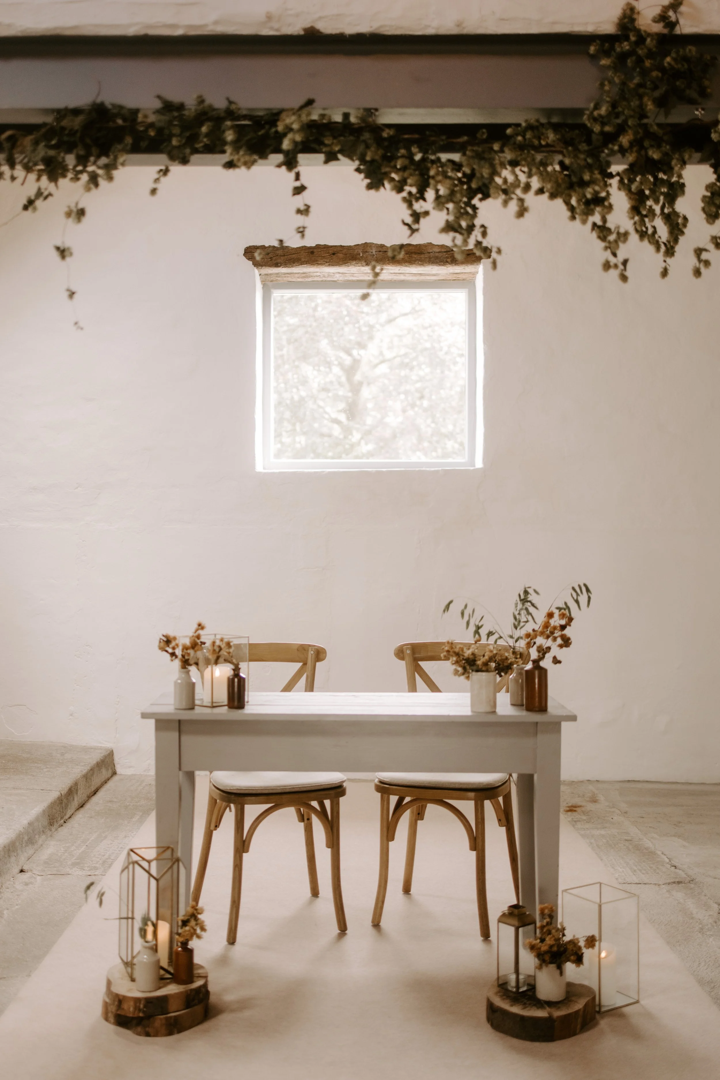 Minimalist table setup with wooden chairs, candles, and dried flowers in a rustic room.