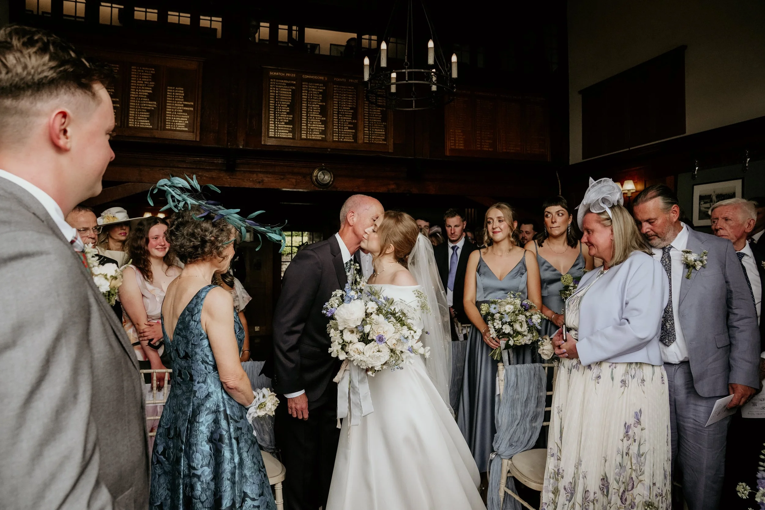 A bride and groom share a kiss during their wedding ceremony in a rustic venue with exposed brick walls and string lights. Guests seated on either side watch and applaud, surrounded by floral arrangements and candles.