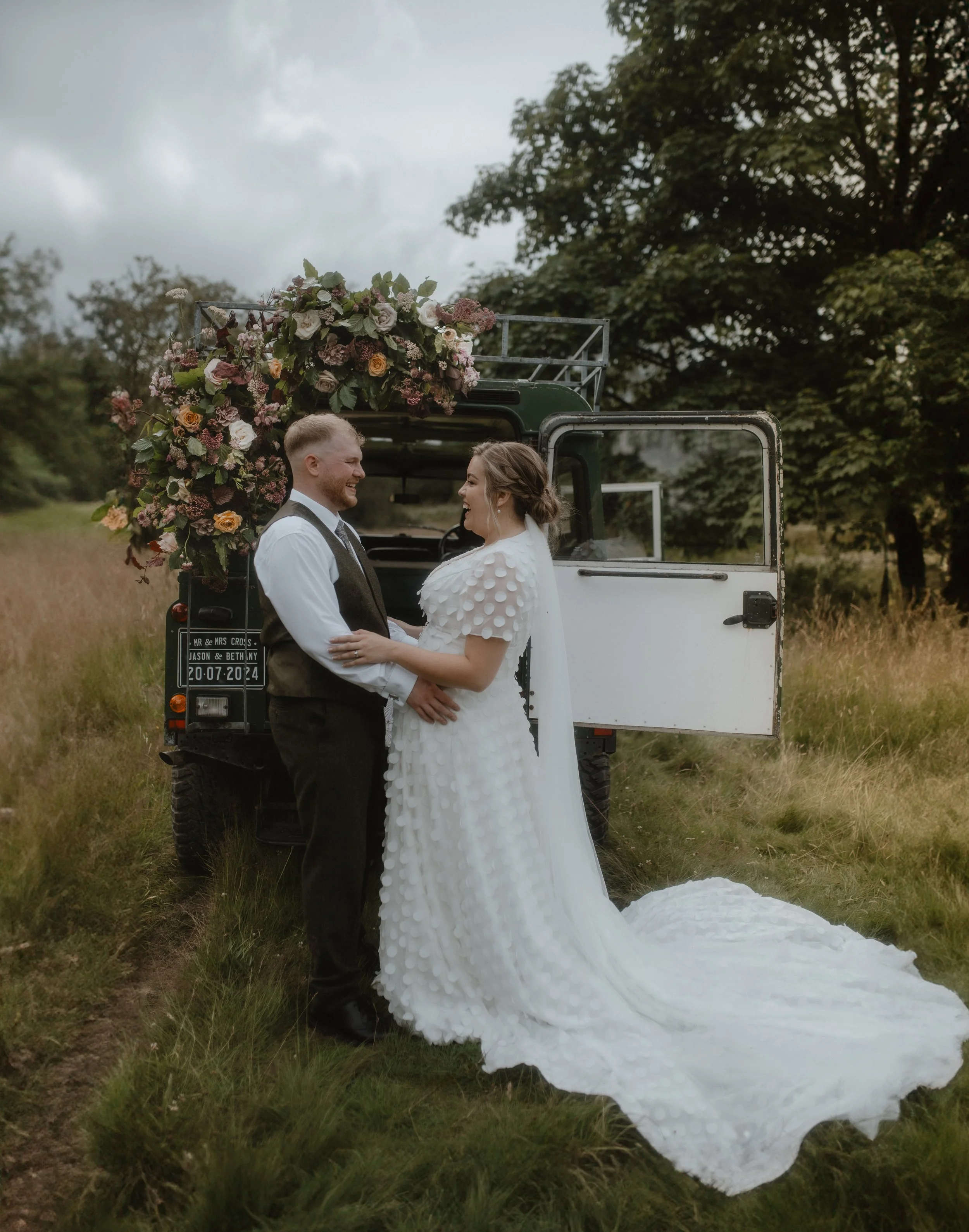 A bride and groom stand beside an off-road vehicle decorated with flowers in a grassy outdoor area.
